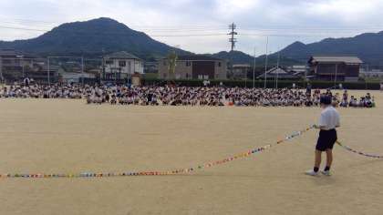 輪飾りがつながった後、運動場に広げて、笹にくくりつけました。大きな輪飾りの輪ができました。まずは、全校児童が、その輪の中に入って記念撮影、その後、全員で輪飾りを持って記念撮影をしました。