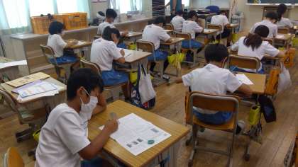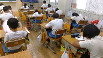 本日の2時間目。5年梅組さんは、国語の授業です。もうすぐ夏休みですが、国語のテストに取り組んでいます。がんばっていますね。「新聞記事を読み比べよう」のテストをしています。シーンと静まりかえった教室の中で、真剣に考えて鉛筆を動かしている子どもたちの姿を見ながら、「私もがんばろう!」という気持ちがわいてきます。