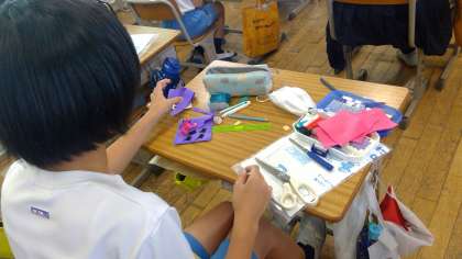 本日の4時間目、5松さんは家庭科の授業です。小物を作っています。ティッシュケースや小銭入れなど、針と糸を使って作っています。飾りつけもしています。よほどお気に入りの作品ができているのでしょうね。「校長先生、見て、見て!」とたくさんの子どもたちが作品を見せてくれて、説明までしてくれました。教室から出て行くと「校長先生が教室に来たら、にぎやかになるなあ!」という声が私の背中の方から聞こえてきました。ご迷惑をかけたかもしれません。