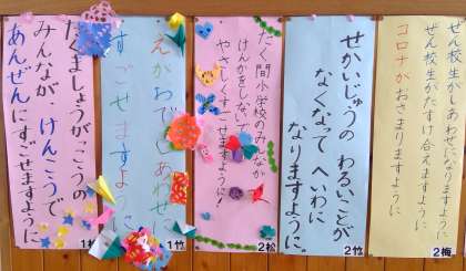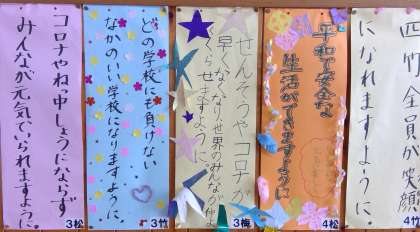 1階パントリー前の壁には「日本一の七夕をしよう!」の時に、各クラスで作った短冊を掲示しています。あの時は、高い所にあったので、他のクラスの短冊はあまり読むことが無かったと思います。全17クラスの「願いごと」です。