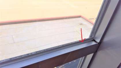 1つ目は、2階、3階の多目的スペースのガラス窓を固定しているゴムみたいな所が、ベタベタと手についてしまうといった点の修理です。上の写真の赤い矢印の所です。この工事は、既に終了しています。