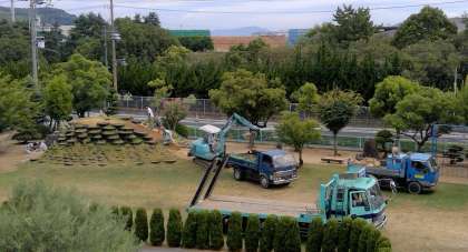 2つ目は、芝生広場のタイヤの山の修理です。今日と明日の2日間で終わる予定です。下の写真のように本格的な工事です。2学期からは、長い間「立ち入り禁止」だったタイヤの山を使うことができますよ。