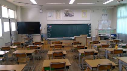 8月11日、山の日の4年竹組さんの教室です。前面には、学級のめあてが掲げてあります。