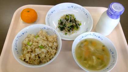 そぼろご飯の中に鮮やかな緑色の豆。色だけではなく食感も味も少し変化していいですね。そして野菜たっぷりの和え物とお汁。まさに「ザ・給食」といった感じです。久しぶりに本校の給食を食べることができとても幸せです。