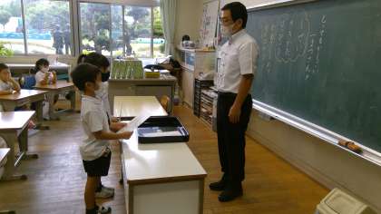 朝の会から朝の活動の時間(学級タイム)。2学期の学級委員の任命式を各学級で行いました。いつものように校長が6年梅組さんから1年松組さんまで、17クラスを順番に巡っての任命式です。1年生は、2学期が初めての学級委員の任命になります。