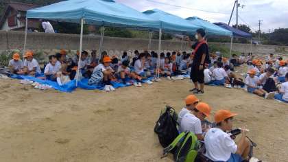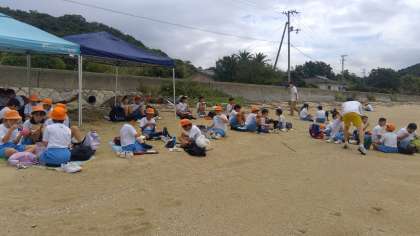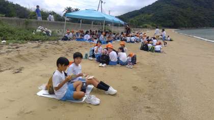 西浜でお弁当です。藤賀先生がテントを張ってくださいました。今日は、お天気が悪いのが幸いして涼しく過ごせます。雨は落ちてきません。天気に感謝です。