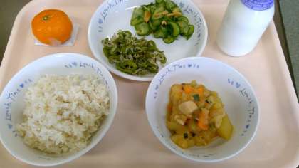○じゃこピーマン…昨日も豆に小魚が入っていて、今日もじゃこが出ています。カルシウムは十分の週ですね。ピーマンの苦みはあまり感じないので、ピーマン苦手な子どもたちも食べやすいかな?