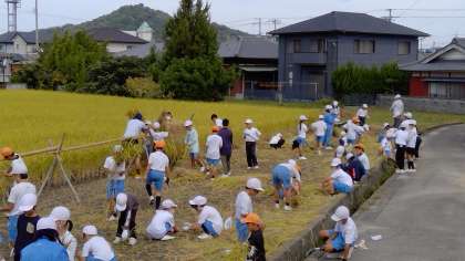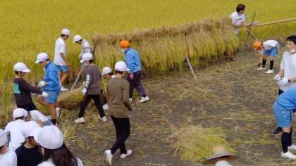 子供たちは、かまを使って稲を刈り取ったり、刈り取った稲をまとめて「はぜ」にかけました。