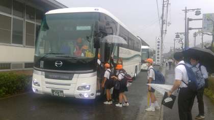 あいにくの雨模様の中、各学年がそれぞれの目的地に向けて出発しました。今日は、運動場にバスを駐車することができなかったので、武道館前から5年→6年・・・1年と、それぞれの学年が大型バス2台に乗り込み、時間差をつけての出発となりました。バスの出発に際しては、通行中のお車に待っていただく等、大変ご迷惑をおかけしました。申し訳ありません。
