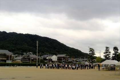 本校の運動場の西半分を使って、第2分館の運動会が行われています。たくさんの人が集まっています。本校の児童の姿も見られます。
