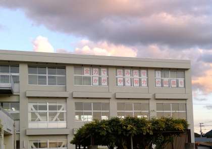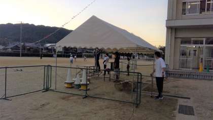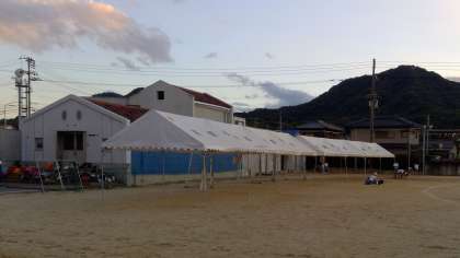 夕方、運動場に出てみますと、陸上特別練習をしながら、テントを張ったり、放送設備をしたりする職員の姿と、東館3階の音楽室の窓ガラスに貼られた「運動会テーマ」が夕陽に輝いて見えました。
