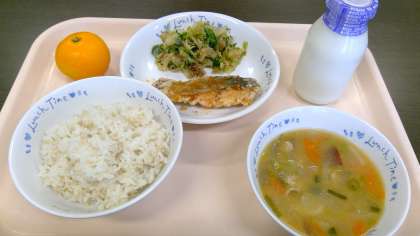 我が家の小さな菜園でも、2、3日前に初めてレタスが採れました。レタスと鰹節の相性がいいのは、給食で初めて知りました。うちでもやってみようと思います。そして、豚汁の中に入っている大根。これも我が家の菜園でもぐんぐん育っています。まだ、収穫には少し早いのですが。栄養教諭が、給食の放送で「旬の食べ物」という言葉をよく使っていますが、自分で野菜を育てていると、野菜の旬が分かっていいですね。ちなみに「自分で育てている」というのは言い過ぎました。私がしているのは、畑を耕運機で耕すことと、夏の間の草抜きだけです。