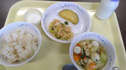 中華料理ですね。ところで「バンサンスウ」は、「拌(ばん)」「三(さん)」「絲(すう)」と書きます。「拌」は、和えるという意味です。まあ、日本で言う和え物、西洋で言うサラダです。「三」は、そのまま3ということです。つまり3種類の食材を混ぜているということです。本当に3種類かどうかというと、それより多いこともあります。だいたい三とか八とかという数字は、「うその三八」といわれるように、だいたいの数、いいかげんな数を表します。「三日坊主」というのも正確に3日でもう飽きてしまう、続かないというのではなく「すぐに」ということを表していますからね。今日のバンサンスウの食材を数えてみてください。正確には、思い出してみてください。そんなの無理、という人は、お配りしている献立表の材料名の所を見ると思い出すかもしれません。「絲」は、糸のように細いという意味で、材料を細く切っている(最初から糸のような食材もあるかも)という意味です。つまり、バンサンスウは、「いろいろな食材を細く切って和えた物」ということになります。