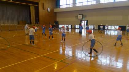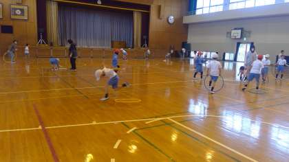 本日の1校時。月曜日の1時間目ですから今週一番最初の授業。2年松組さんは、体育の授業です。今日は、体育館でフラフープを使って運動しています。12月に入って急に寒くなりましたが、体育の時は、真夏と同じ半袖の子どもたちが多いのでびっくりしました。「子どもは風の子」ですね。