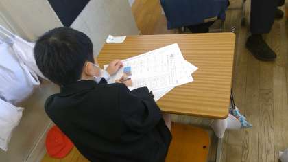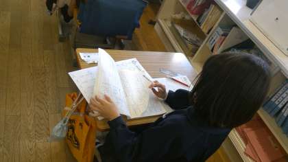 本日の5時間目。2年梅組さんは、担任の教員がいないので自習です。「漢字プリント」を3枚しています。自習といっても、代わり(補欠)の教員と支援員は教室でいますので、がんばっている子どもたちの手助けをしてくれます。
