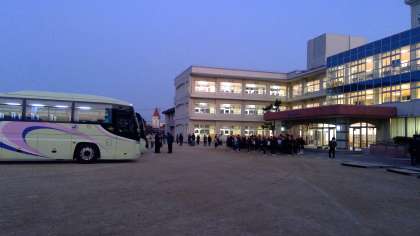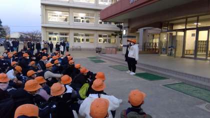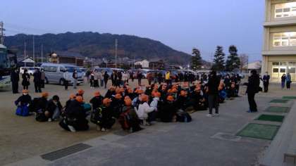 出発式です。まだ、薄暗い中ですが、児童玄関前で出発式が行われました。3年ぶりの京阪神への修学旅行が実現できたことを喜び、1泊2日、楽しい思い出をいっぱい作ってくると心に誓い、これから出発します。行ってきます。