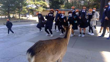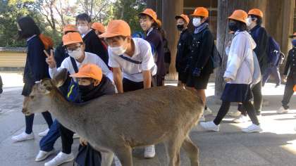 奈良公園(大仏殿、二月堂等)を見学した後、昼食のカツカレーを食べて、今は、お買い物タイムです。全員元気ですので、ご安心ください。