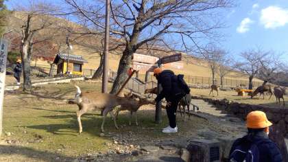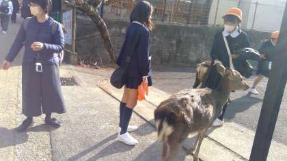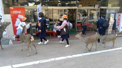 鹿と遊ぶ子どもたち。これから、奈良を後にして、金閣寺に向かいます。