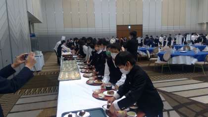 本日のホテルの夕食です。2枚目の写真のように、各自で夕食を取っていきます。これは給食と同じですね。