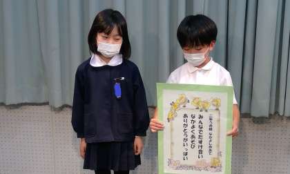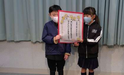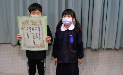 2年生3クラスの「なかよしめあて」の発表の様子です。