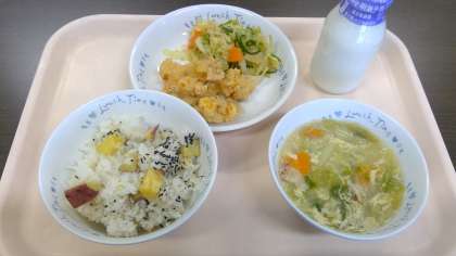 今日のメニューも大好きです。さつまいもご飯は、甘くて香ばしいです。豆腐のちぎり揚げは、表面のサクサク感と中のしっとり感がたまりません。キャベツも甘さすら感じます。レタスとベーコンは相性が抜群ですね。