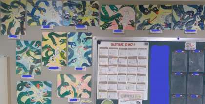 4年竹組の教室に掲示している作品です。懇談会や授業参観・学習発表会の時に十分見ることができなかったという方は、お子様にどの作品なのかを聞いて、ゆっくりご覧ください。なお、階段の踊り場に掲示している作品は、後日、アップいたします。