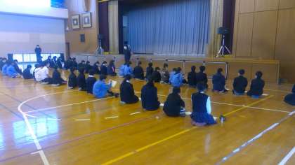 今朝は、登校班の班長さんが体育館に集まって「登校班長会」が行われています。担当の教員からは、「事故無く安全に登校をお世話してくれてありがとうございます。」とか、「1年生の歩く速さに合わせて歩いてくれている班長さんがいると、地域の方が誉めてくださっていました。」などの話がありました。班長さん、3学期もよろしくお願いします。