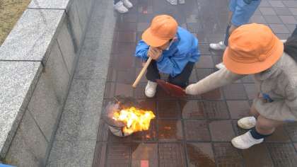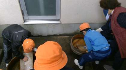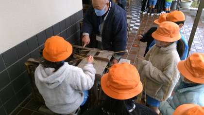 1月27日に詫間町の民俗資料館に見学に行きました。少し雨が降っていましたが、火起こし体験や縄ない体験など様々なことを体験することができました。洗濯板とたらいを使ってハンカチを洗いました。水が冷たかったのですが、一生懸命、力を込めて洗っていました。昔の人は、毎日大変なことをしていたことに気付くことができました。昔の道具を体験することができて、とても楽しかったようです。