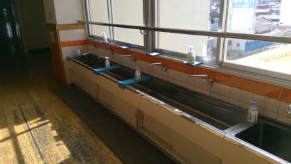 3階の5、6年生の手洗い場にも、1、2階と同じハンドソープ置き場を設置しました。ただし、3階は、高い位置にあったこれまでのハンドソープ置き場と、流しのすぐ上に置いた可動式のハンドソープ置き場の併用です。ですから、各手洗い場に3つしか設置していません。5年生に意見を聞いたところ、これまでのハンドソープ置き場の方がいいという意見もありましたので、このようにしました。