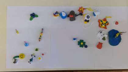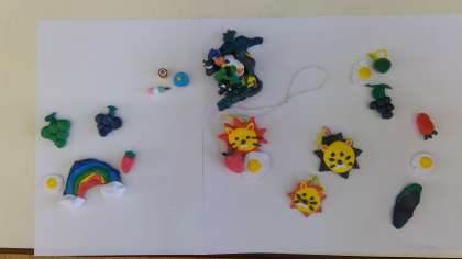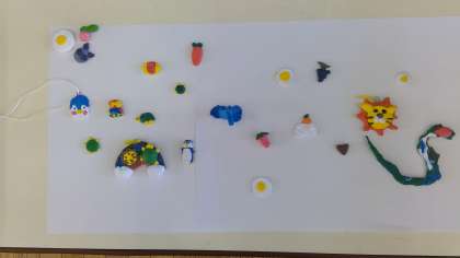 子どもたちの多くが、初めての紙粘土を使っての作品作りでした。だんだん作品作りにも慣れ、黄色と赤でオレンジになる。青を多くして黄色と混ぜて黄緑色にしようなど、色作りにもたくさんの工夫が見られました。素敵な作品ができあがりました。もし、裏の磁石が外れたときは、木工用ボンドなどで、修理していただければと思います。