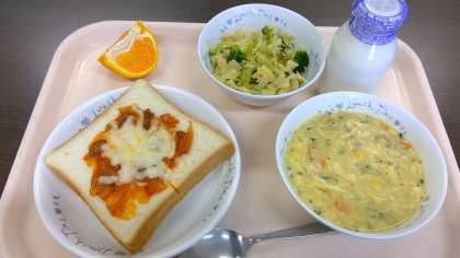 ○ピザトースト ○牛乳 ○ブロッコリーのサラダ ○コーンスープ ○デコポン