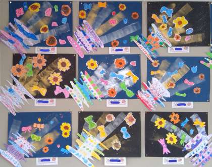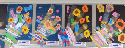 2年松組さんの教室に掲示している図工の作品を紹介します。なお、階段の踊り場に掲示している作品は後日アップします。