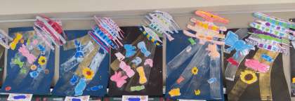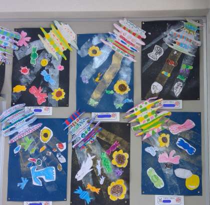 2年竹組に掲示している図工の作品です。なお、階段の踊り場に掲示している作品については後日アップします。