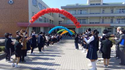 式の予行の後は、見送りの予行も行いました。今週の金曜日。6年生の皆さんは、この花のアーチをくぐり抜けて巣立って行くのですね。