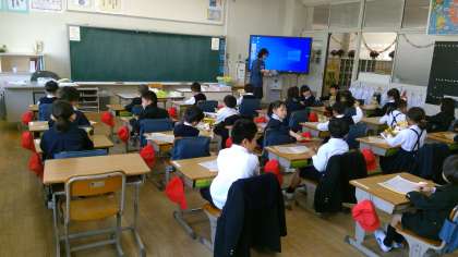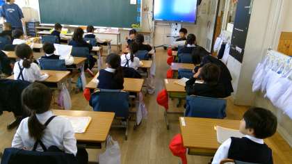 本日の3時間目の後半。1年竹組さんは、帰りの用意をしています。プリントなどの配布物を、席の前の子どもが「どうぞ!」と後ろの子どもにわたして、後ろの子どもが「ありがとう!」と言ってもらっています。これは、本校では、どのクラスもしていることです。1年生がすると「かしこい!かわいい!」と思ってしまいますね。とても姿勢良く話を聞いています。素晴らしい授業2日目でした。