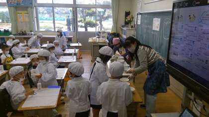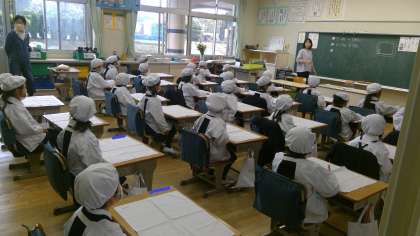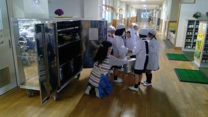 今日から1年生も給食が始まります。4時間目の途中から、給食の準備の仕方をお勉強して、他の学年より少し早めに準備を始めました。初めてなのに、とても上手に準備ができていました。素晴らしいですね。スーパー1年生です。