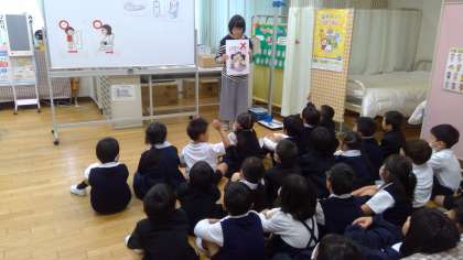 どんなときに保健室に行くのかなど、クイズ形式で保健室の使い方を勉強しました。また、トイレの使い方も復習しました。先生の話を静かに聞けました。頑張っている1年生です。