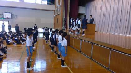 本日の朝の活動の時間、体育館に全校児童が集合して「1学期の学級委員任命式」がありました。実に、この形で任命式を行うのは4年ぶりです。