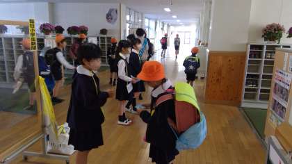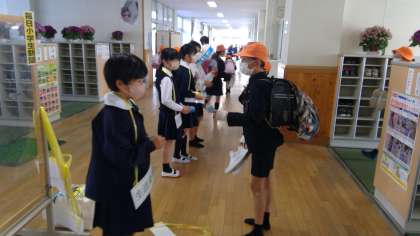 生活委員さんたちが、児童玄関の所で「あいさつ運動」をしています。あいさつができた子に、カードを手渡しています。「おはようございます。」の声が、廊下に響きわたり、とても気持ちの良い朝のスタートとなっています。今週いっぱいが「あいさつ週間」です。