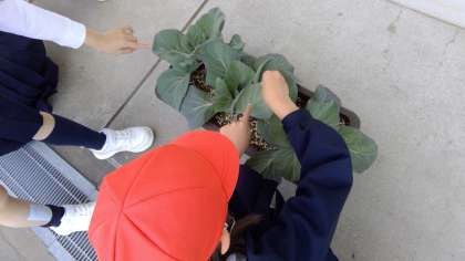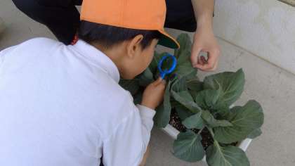 キャベツの葉の裏側にたまごを見つけ、実物のたまごの小ささに驚いていました。また、虫めがねを使って観察すると、トウモロコシのような形もよく見えました。