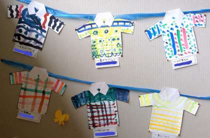階段の踊り場に掲示している3年生の作品です。