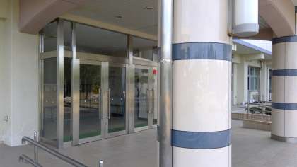 本館と東館の1階の窓ガラスを、外側から高圧洗浄機で掃除しました。