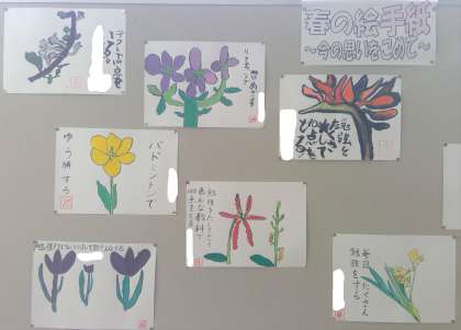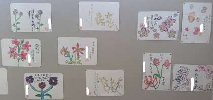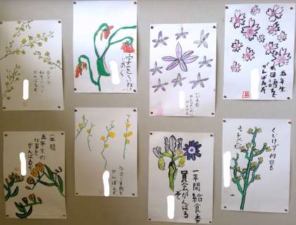 階段の踊り場に掲示している5年生の作品です。