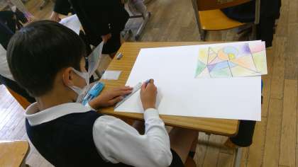 大型連休明けの月曜日(しかも)1時間目。5年竹組さんは図工の授業です。なかなか楽しそうです。そして、集中して取り組んでいます。どうやら自分の名前(ローマ字・ひらがな等)をデザインしています。よく見ると、○○さんの名前だ!と分かるようにできています。下書きは完成していて、今日は四つ切りの画用紙に描いています。