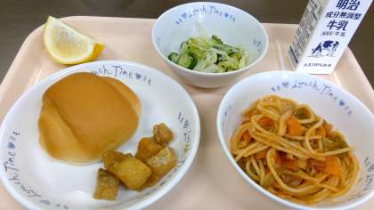 しかし、私の中では微妙なイメージの違いがあります。イタリアンは、比較的水分量が少なく、ナポリタンはしっとりしているイメージなのです。皆さんは、どうですか?そんなことを考えながら、ダブル主食の給食をいただいています。