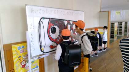 輪郭だけだった「こいのぼり」が、子どもたちの挨拶シールで、だんだん青く、赤くなってきています。