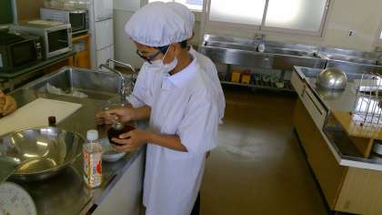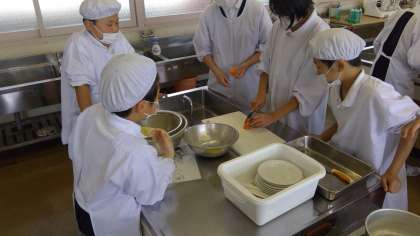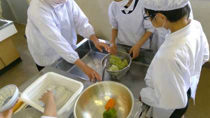 本日の5〜6時間目。6年梅組さんは、家庭科の授業です。今日は、久しぶりに、本当に、久しぶりに調理実習をしています。「野菜いため」と「ゆで卵」を作っています。今日は、6年生3クラスとも、調理実習の日でした。その3回目が、6年梅組さんです。この光景を目にするのも久しぶりですが、調理実習ができるようになって、本当によかったです。グループで、協力して、アイデアを出し合って、がんばっています。