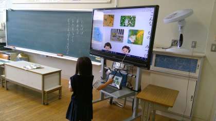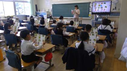 本日の3時間目。1年松組さんは、国語の授業です。「みんなに はなそう」という単元のお勉強です。1年生は、入学して1か月と少しですが、とても素晴らしいお勉強ぶりです。びっくりしました。手を挙げて、しっかり発表できます。お友達の発表も、しっかり聞いています。「ぼくは、なにをみつけたでしょうか。○ではじまります」→「どこでみつけましたか?」→「○○でみつけました。」→「○○だとおもいます。」→「せいかいです。ぼくは、○○で○○をみつけました。」といったふうに、お話をしていくようです。まずは、教科書に載っている写真について、みんなで話をしています。