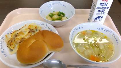 マカロニグラタンのチーズの焦げ具合がちょうどよくて、おいしいです。そして、温かいです。うちの家族3人分のグラタンだけを作るのも大変なのに、何百人分の給食をたった7人で作っているのです。すごいなあと思います。新じゃがとアスパラガスのサラダ、和風のドレッシングがさっぱりしていて、とてもおいしいです。2つの違った食感がこれまた絶妙です。オレンジ・白系のスープと、緑・白系のサラダの色も綺麗です。