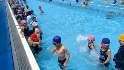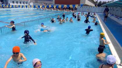 本日の3時間目。2年生はプール開きです。隣の深い方のプールでは6年生もプール開きをしています。